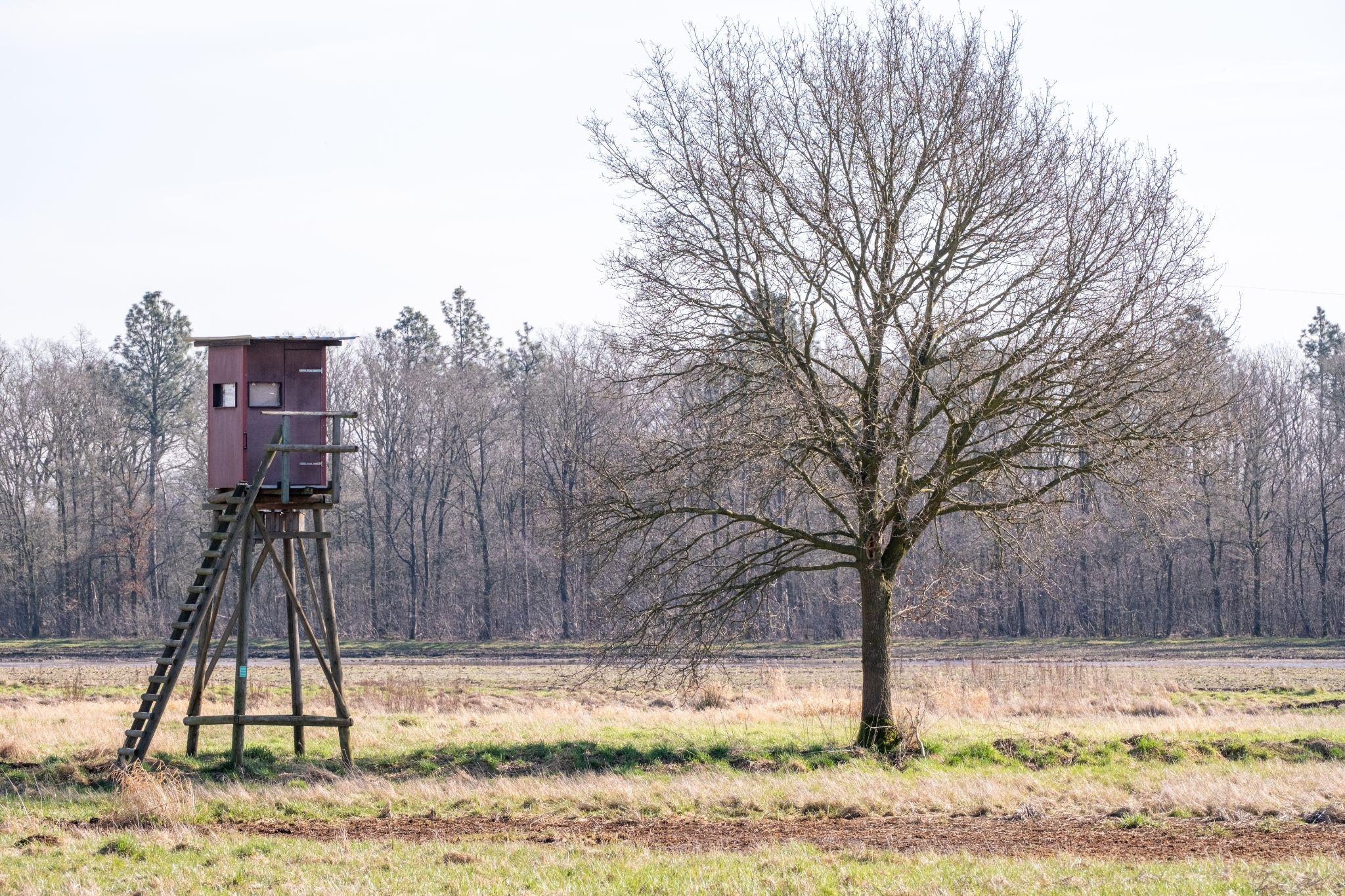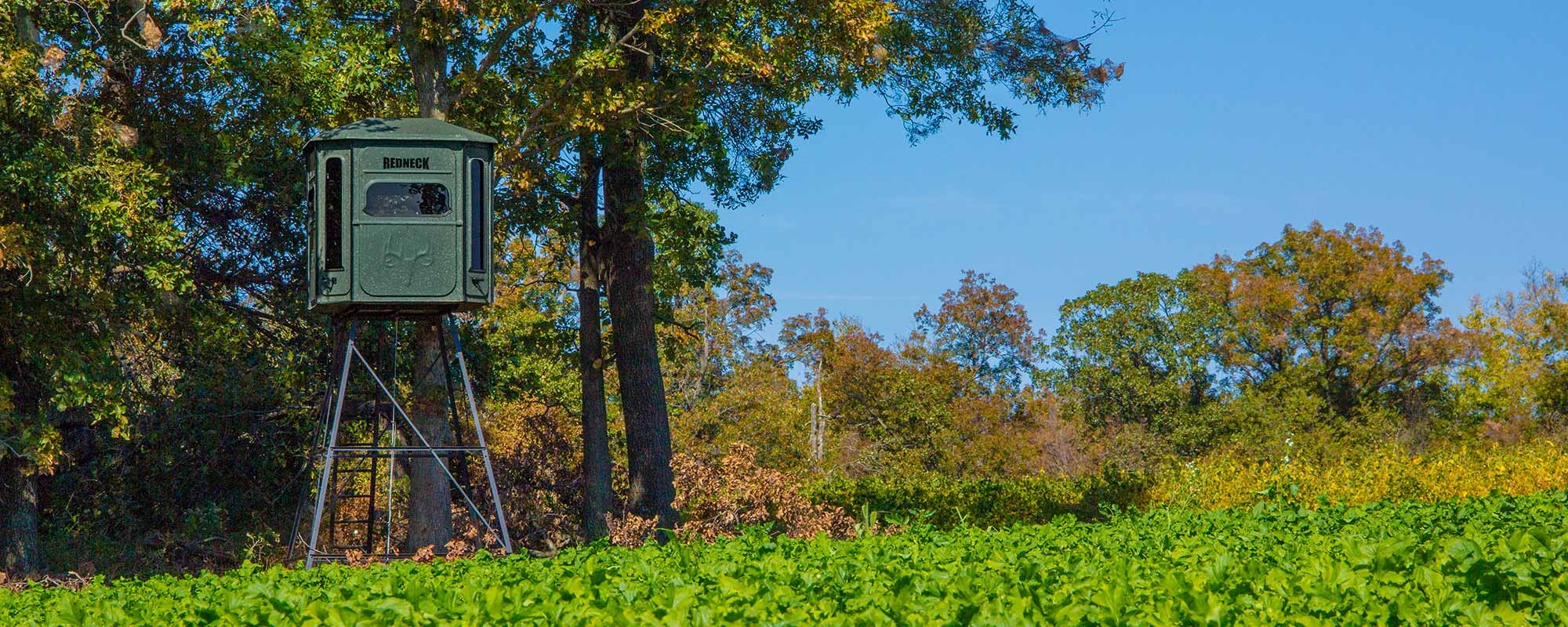 Elevated hunting blind with hunter approaching – Redneck box blind for deer hunting in Kentucky woods